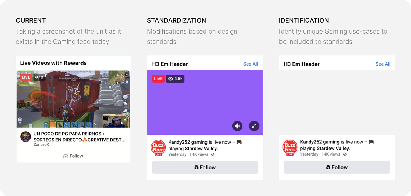 Facebook Gaming lived under the Entertainment organization. There were multiple layers of design systems to adhere to: Facebook design system, Entertainment product system and finally Facebook Gaming’s design system