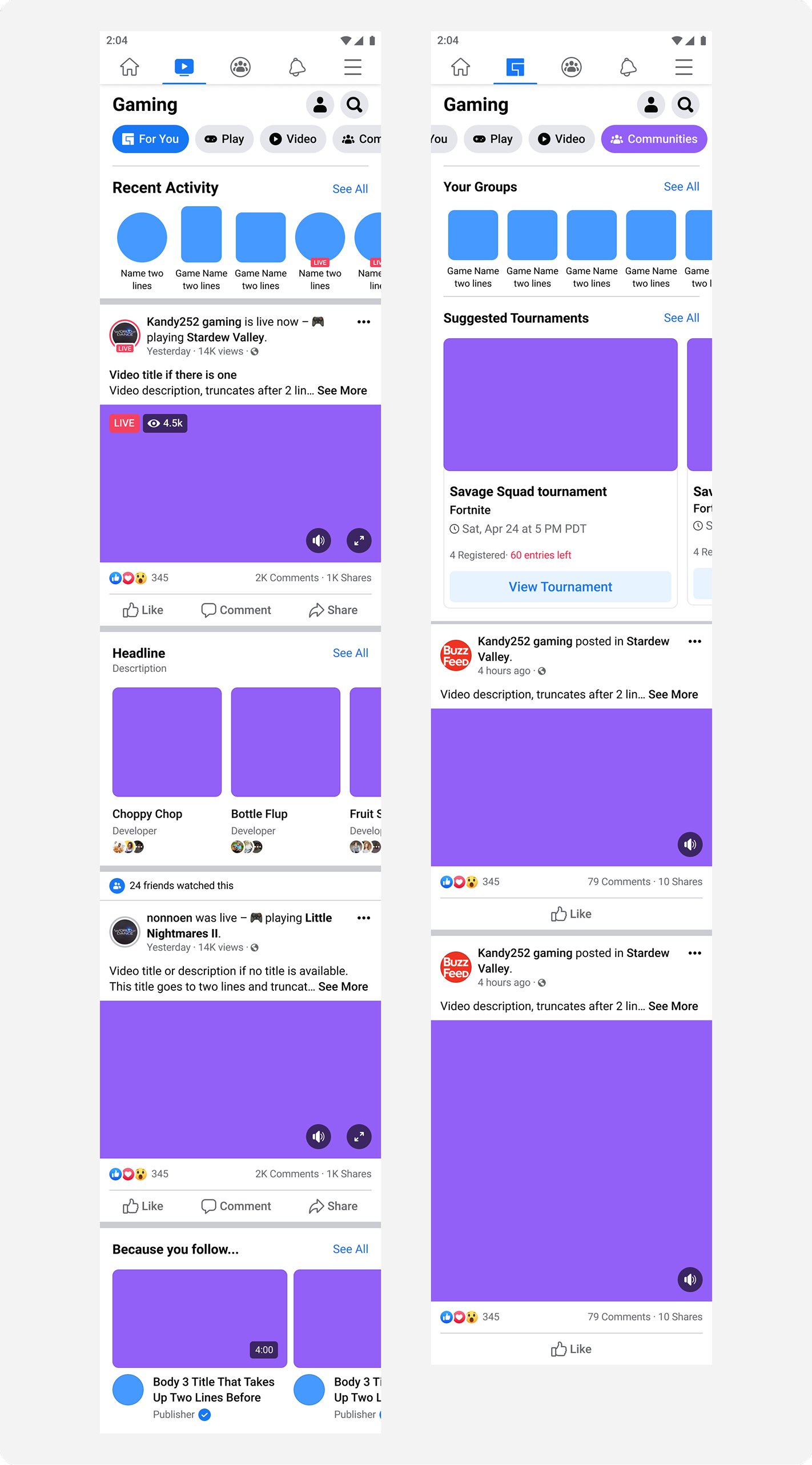 Created design consistency across Facebook Gaming news feed, shortening development time with reusable components