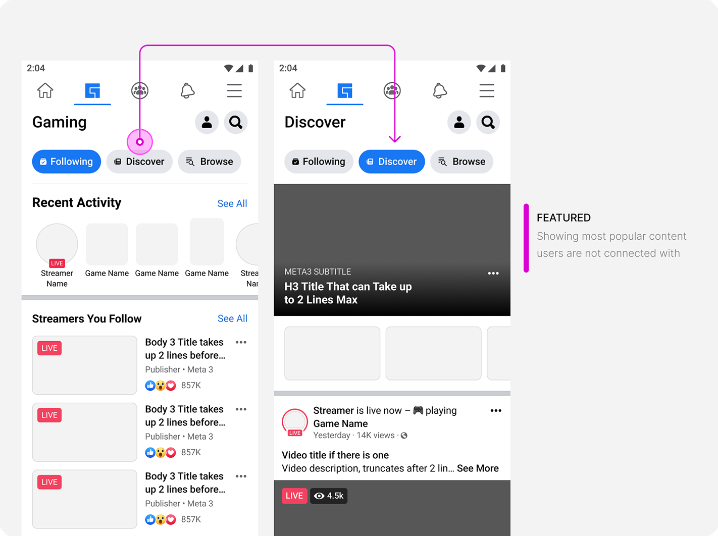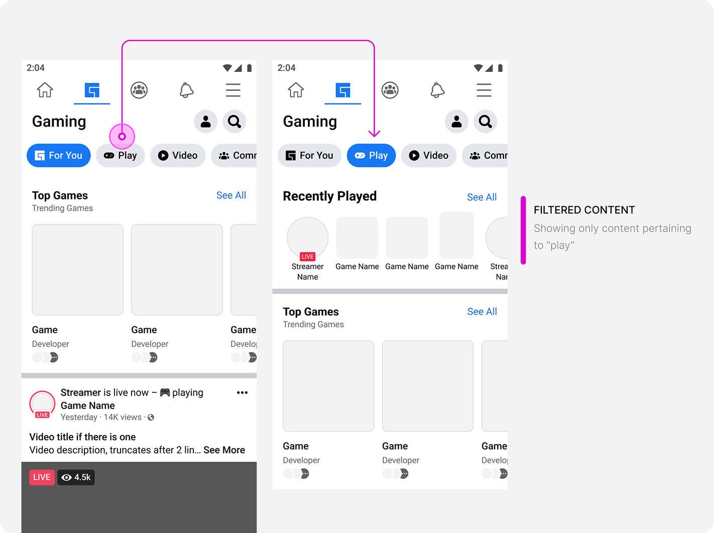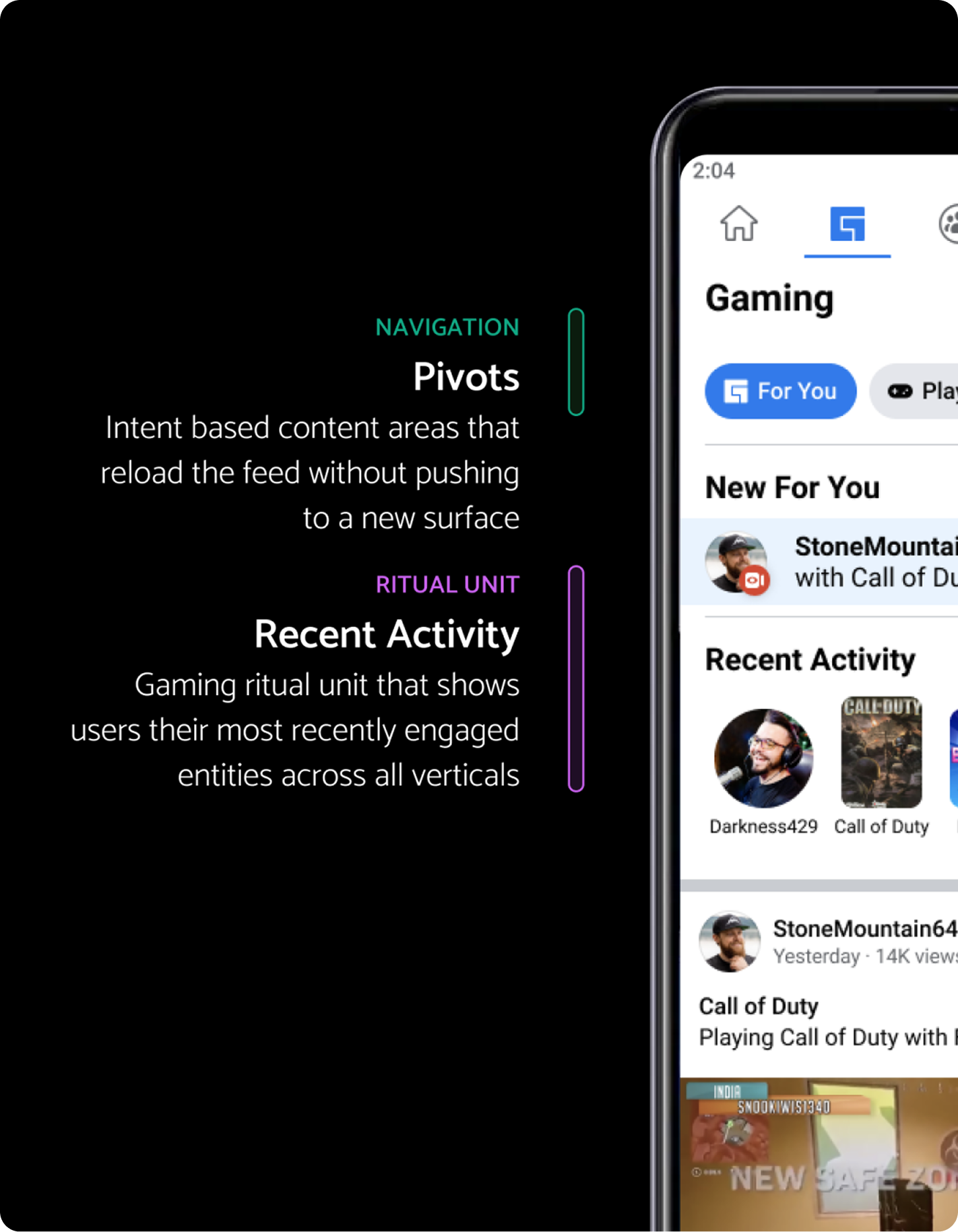 Content is primarily passive scrolling and more heavily reliant on machine learning for targeting and springboards. The flat feed does not consider users who do not want to passively scroll, but come to gaming with an intent. This type of navigation is not a consistent experience.